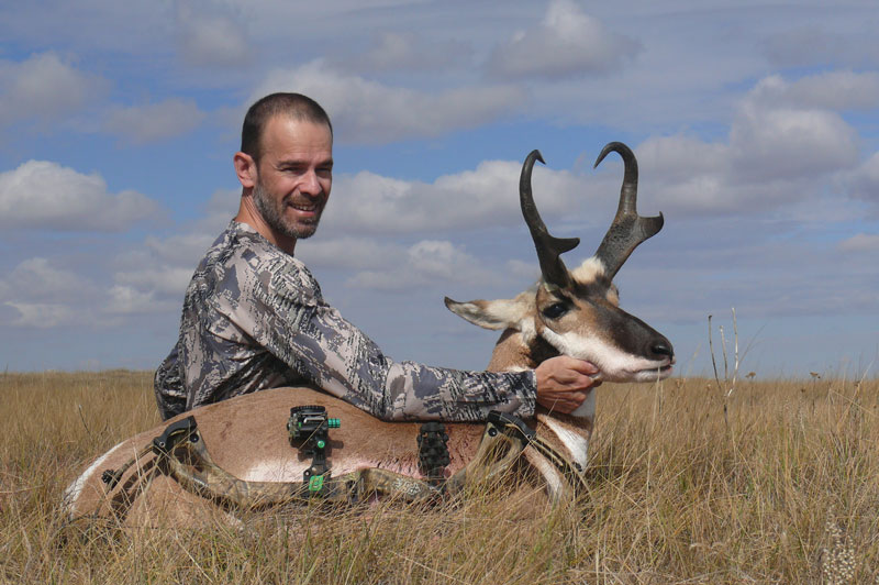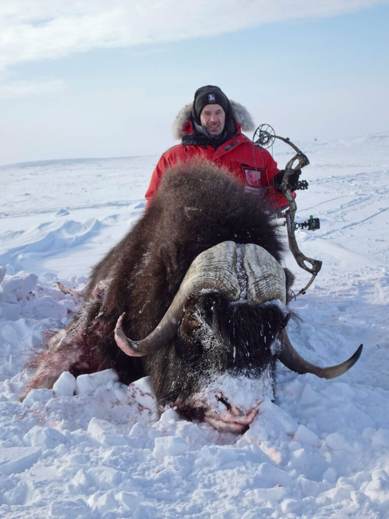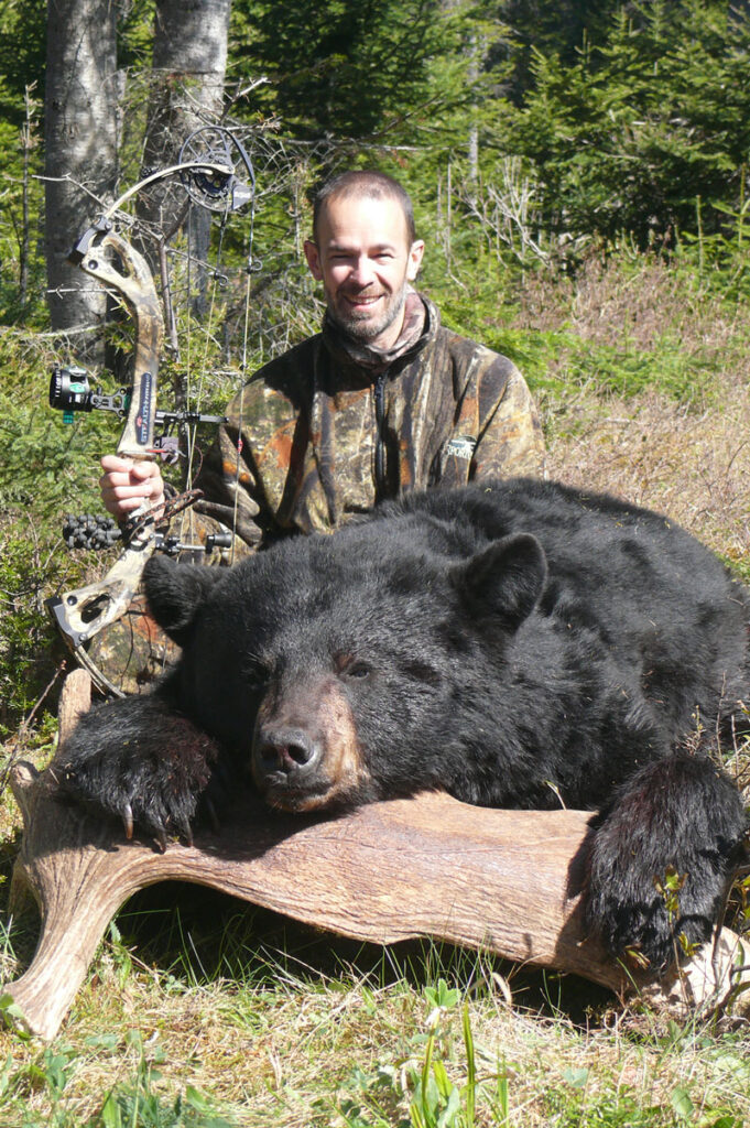 L’auteur est un des deux seuls québécois à avoir réussi le Super Ten, soit la récolte de 10 grands gibiers Nord-Américains (un dans chacune des 10 catégories). On le voit ici qui pose avec quelques-uns de ses trophées, dont plusieurs récoltés à l’arc. A-Ours noir B-Cougar C-Bœuf Musqué D-Antilope E-Mouflon.